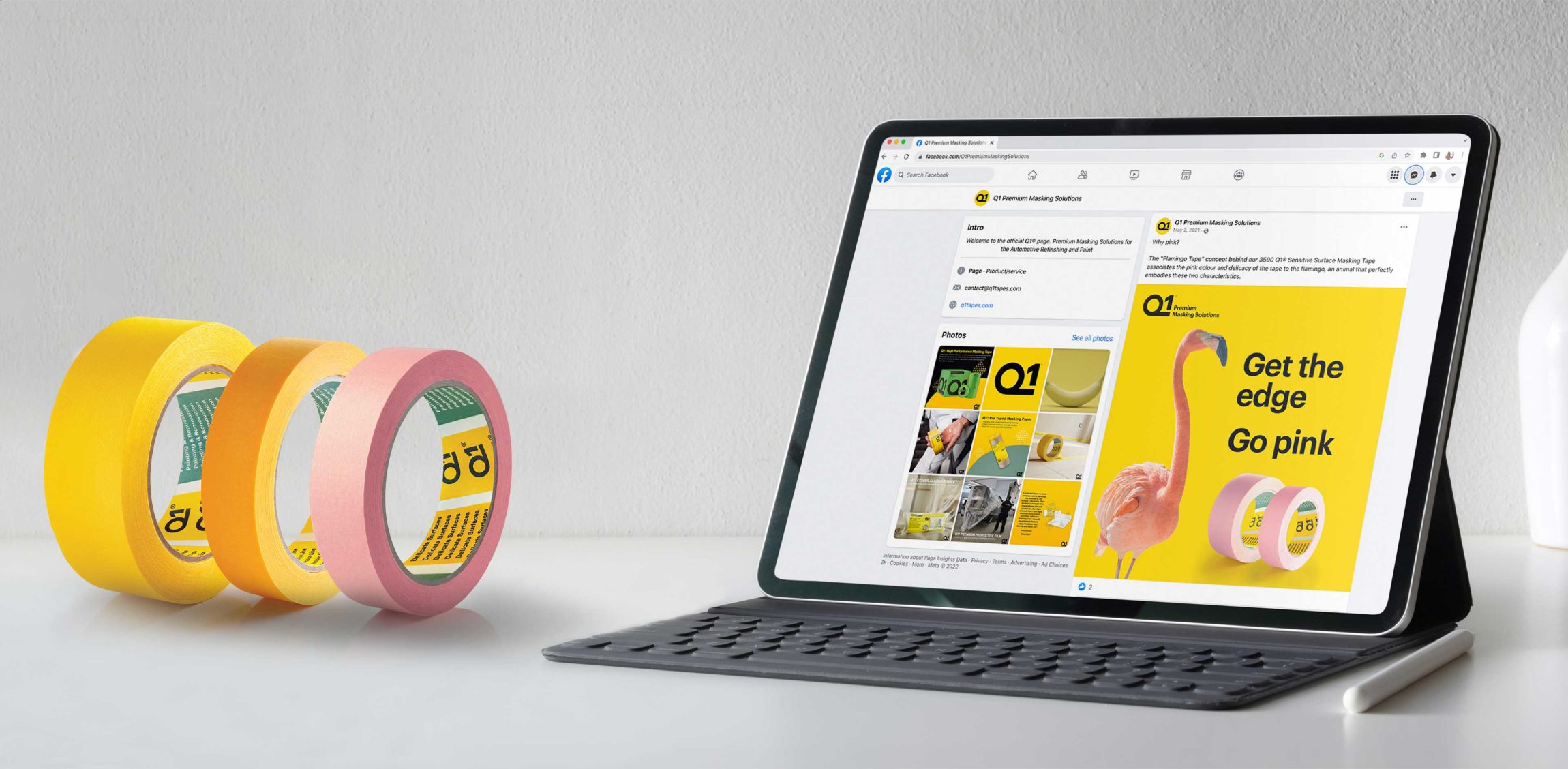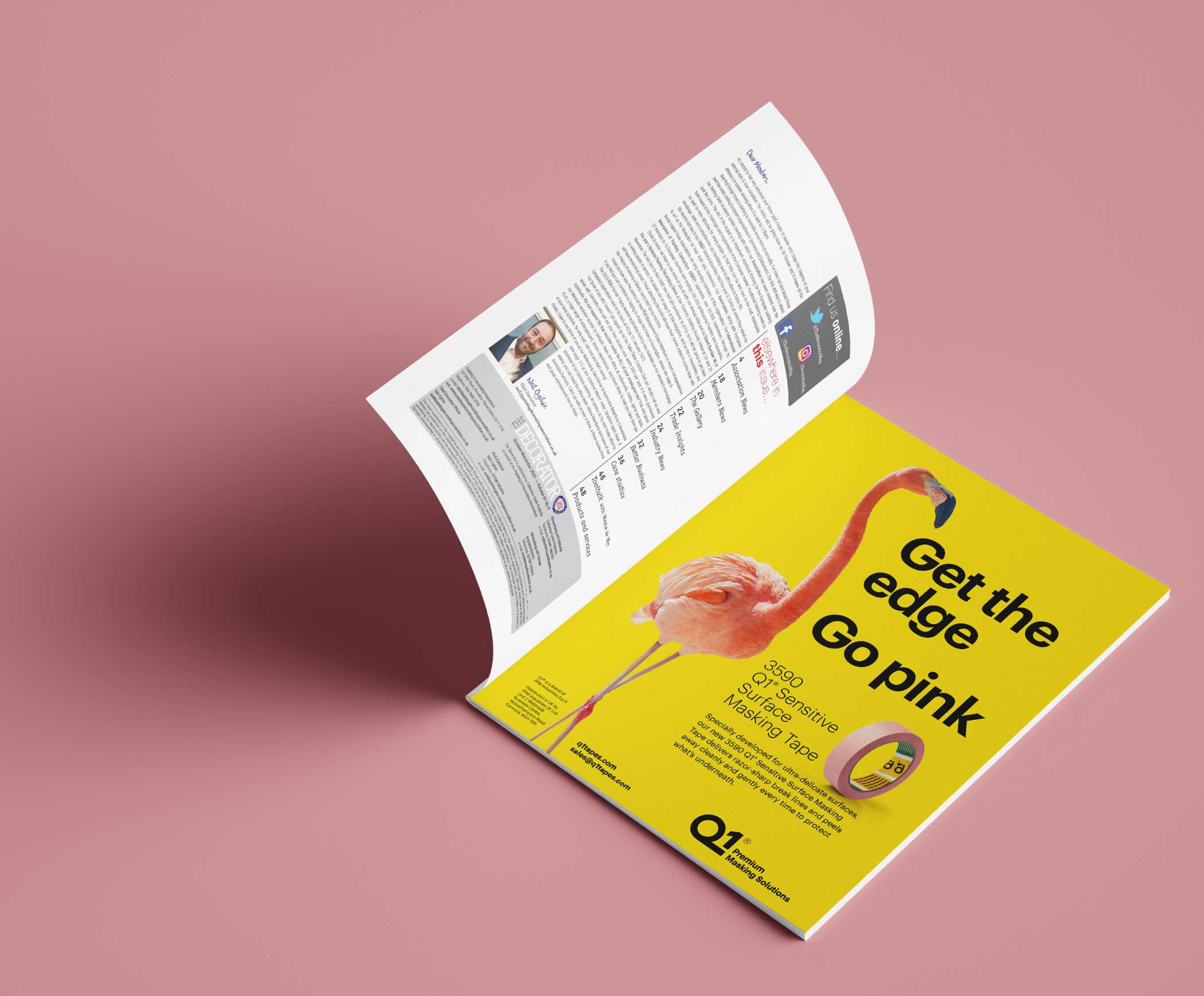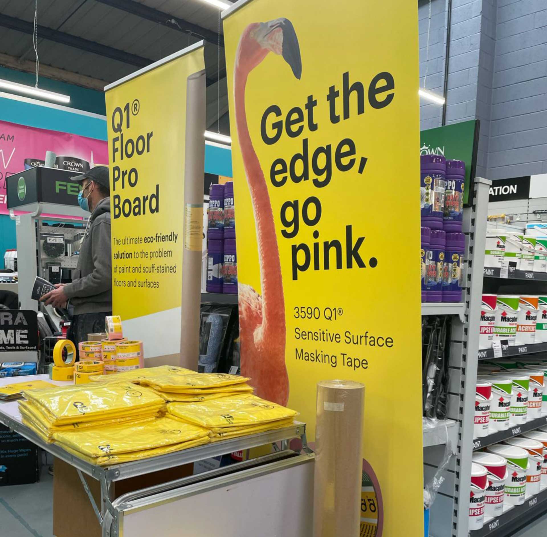 To emphasise the distinctive pink colour of Q1®’s new Sensitive Surface Masking Tape and really capture attention, striking imagery of flamingos was deployed alongside the strapline ‘Get the edge, go pink’.